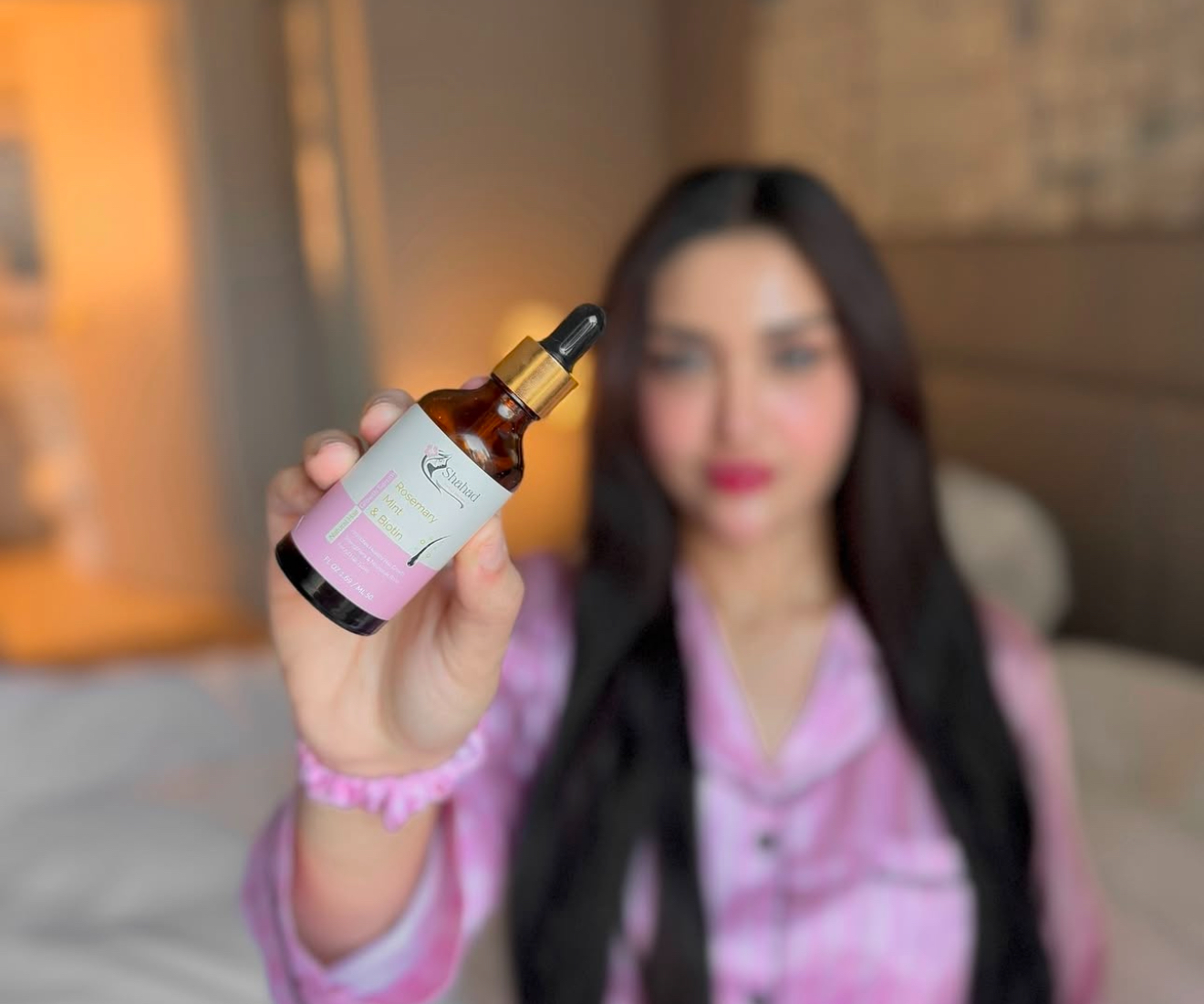 Our hair serum enhances thickness, promotes stunning length, and reduces hair loss. It nourishes hair follicles and stimulates the scalp, providing a refreshing experience that supports optimal hair growth
